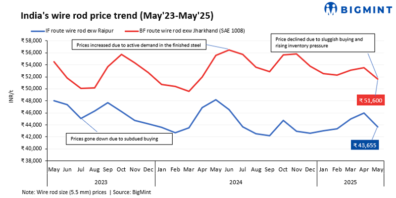 Primary market sees weak demand: In the BF-segment, wire rod prices (5.5-6mm, SAE1008) dropped by INR 1,900/t ($22/t) m-o-m to average at INR 51,600/t ($603/t) exw-Jharkhand in May. Average monthly prices dropped m-o-m amid sluggish demand in the domestic market. Wire rod demand remained weak throughout the month, leading to a steady decline in prices. Sluggish market sentiments further contributed to continued softening in prices.