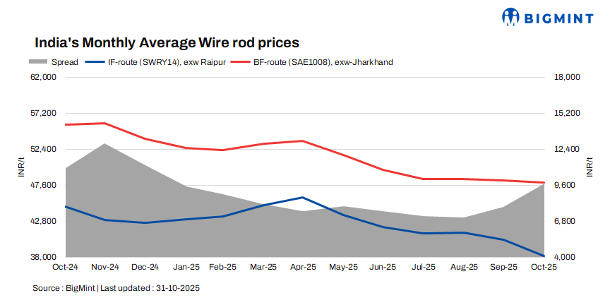 In the BF segment, wire rod prices (5.5-6mm, SAE1008) edged lower m-o-m by INR 300/t ($3/t) to a monthly average of INR 47,900/t ($540/t) exw-Jharkhand in October 2025. Prices touched their lowest levels in four-and-a-half years in October 2025.