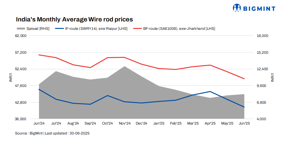 Indian wire rod prices declined m-o-m in June 2025. In the induction furnace (IF)-route segment, wire rod prices witnessed a monthly average decrease of INR 1,800/tonne (t) ($21/t) to INR 40,800/t ($478/t) exw-Durgapur and by INR 1,650/t ($19/t) to INR 41,400/t ($485/t) exw-Raipur as compared to May. IF wire rod prices hit a seven-month low in June in both locations amid weak demand.