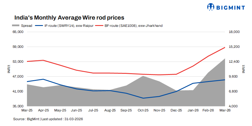 Indian wire rod prices surged m-o-m in March 2026 in both the induction furnace (IF) route and the BF route segment. The sharp rise in IF route wire rod prices can be attributed to the ongoing conflict in the Middle East.