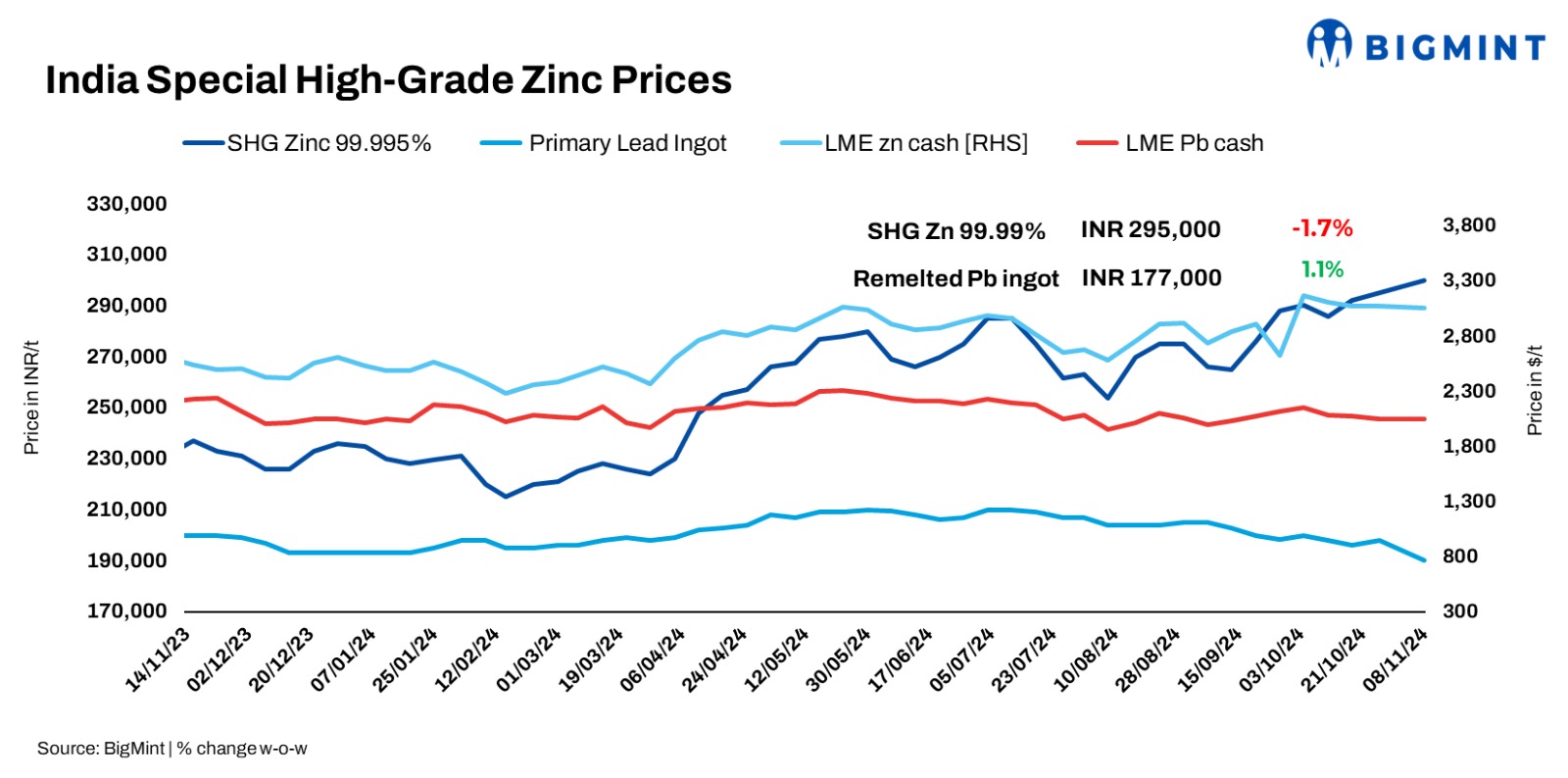 India’s domestic zinc ingot prices dropped by INR 1,500/t (18/t) w-o-w to INR 295,000/t ($3,496/t), following a 2% decline in LME futures. Meanwhile, lead stood at INR 179,000/t ($2,120/t), a rise of INR 2,000/t ($24/t). Hindustan Zinc (HZL) saw slight reductions up to 4%, with zinc at INR 301,300/t ($3,571/t) and lead at INR 200,500/t ($2,375/t). European-origin lead stripping cables were traded at 98% LME CIF Chennai.