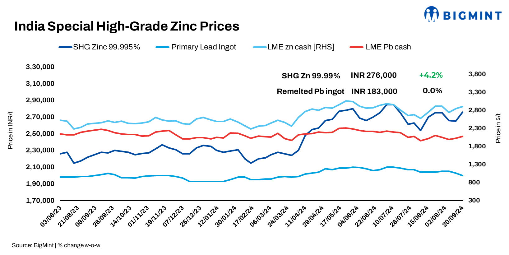India’s domestic zinc ingot prices increased by INR 11,000/t ($132/t) to INR 276,000/t, aligning with a 6% rise in HZL prices. Meanwhile, zinc LME prices were stable at $2,902/t. Remelted lead ingot trades were concluded at INR 182,000-184,000/t ex-Delhi today, while zinc ingot (99.96%) trades were heard at INR 276,000/t ex-Haryana. Import offers for Australia-origin lead scrap were heard to be at 95% LME CFR Chennai.