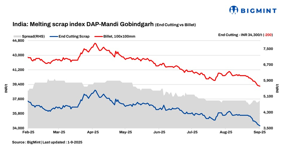 BigMint’s domestic end-cutting scrap index, tracking the Mandi Gobindgarh market, fell by INR 200/t d-o-d to INR 34,300/t DAP on 1 September 2025.