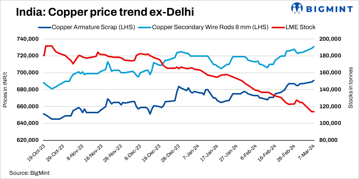 Domestic copper prices inched up to 0.3% today. Armature scrap prices stood at INR 691,000/t and secondary rods prices were at INR 731,000/t both ex-Delhi. BigMint’s assessment of brass honey scrap (4%) from the Middle East rose by 1% w-o-w to $5,490/t. 15 t copper CCR was heard traded at 731,000/t ex and 45 t aluminium talk from the US was traded at 53.5% LME prices recently.
