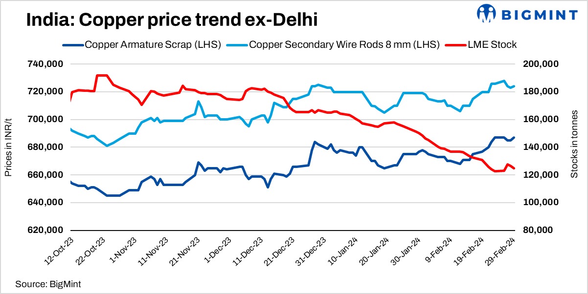 Domestic copper prices rose marginally up to 0.3% today. Armature scrap prices stood at INR 687,000/t and secondary rods prices were at INR 724,000/t both ex-Delhi. Demand remained positive. Copper armature was heard traded at INR 687,000/t ex Bhiwadi and 683,000/t ex Ahmedabad.