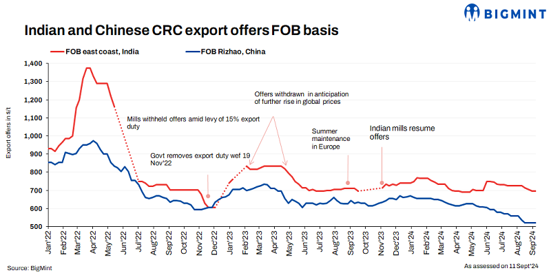 Indian CRC export offers to the EU remained flat w-o-w at $695/t CFR Antwerp ($645/t FOB east coast, India). The European CRC market is currently stagnant due to weak demand from key sectors such as automotive and construction. Additionally, Chinese CRC export offers remained unchanged for the week at $520/t FOB.