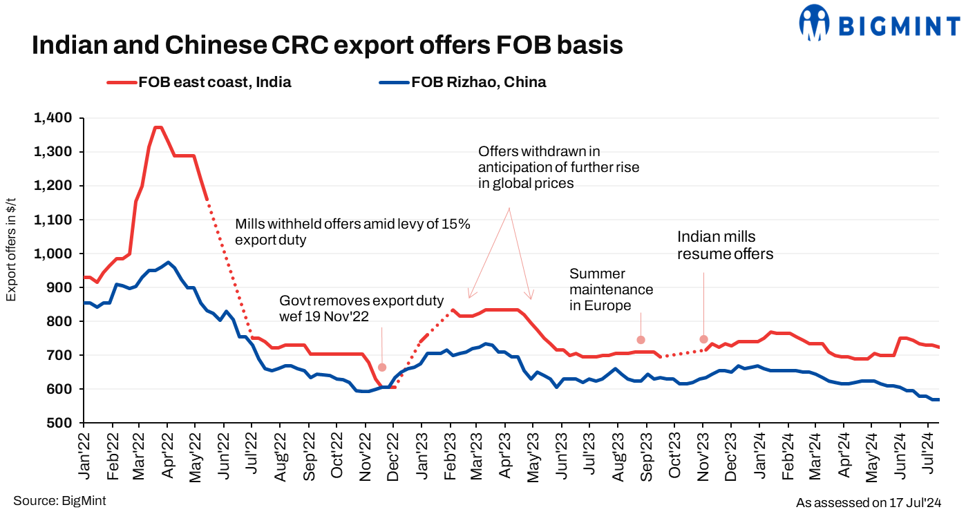Indian CRC export offers to the European Union (EU) remained range-bound w-o-w at $725-730/t CFR Antwerp ($675-680/t FOB east-coast India) due to low domestic demand and low global market sentiments. However, a deal of around 3,500 tonnes (t) has been heard concluded at similar levels for late August shipments.