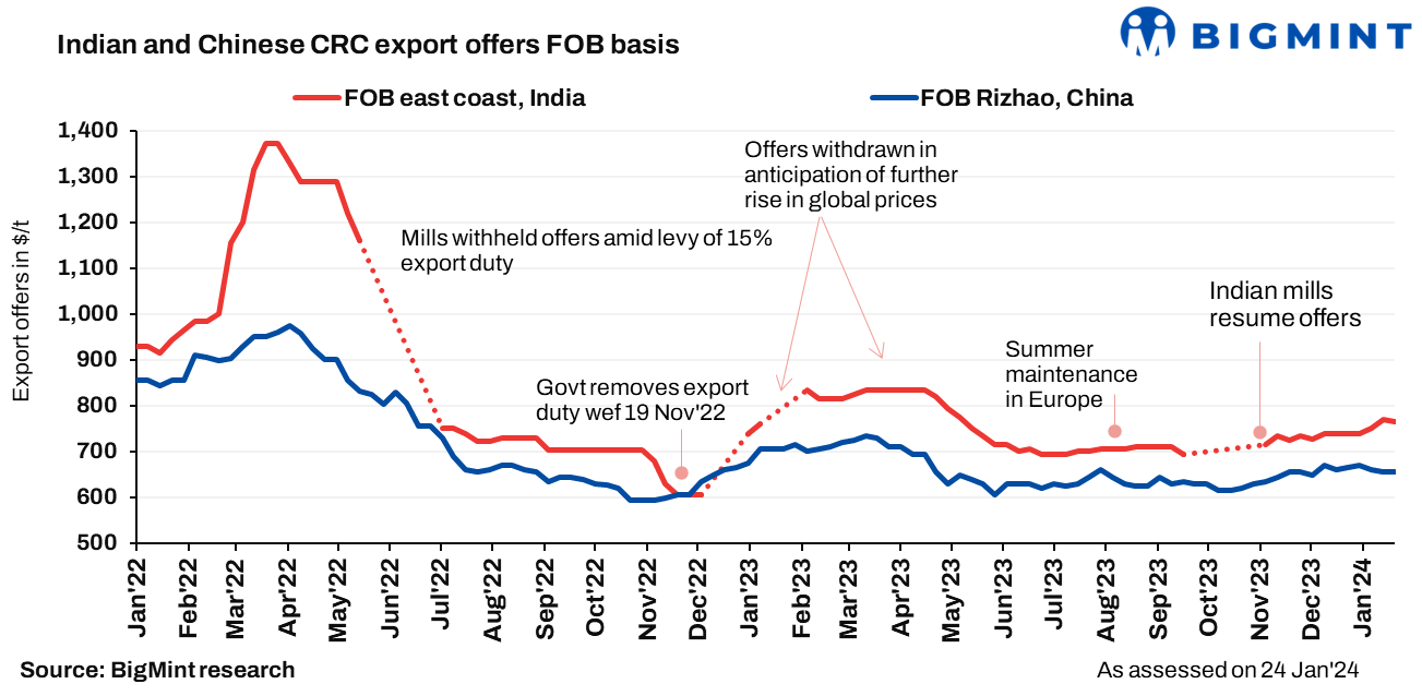 Indian CRC export offers remained range-bound w-o-w at around $815-820/t CFR Antwerp ($765-770/t FOB east-coast India). Moreover, a small quantity deal of approximately 6,000 t has been reported at around $815/t CFR Antwerp for late-Feb and early-March’24 shipments. Domestic prices in EU showed uptrend. However, domestic demand is weak. In addition, global CRC prices also remained flat.