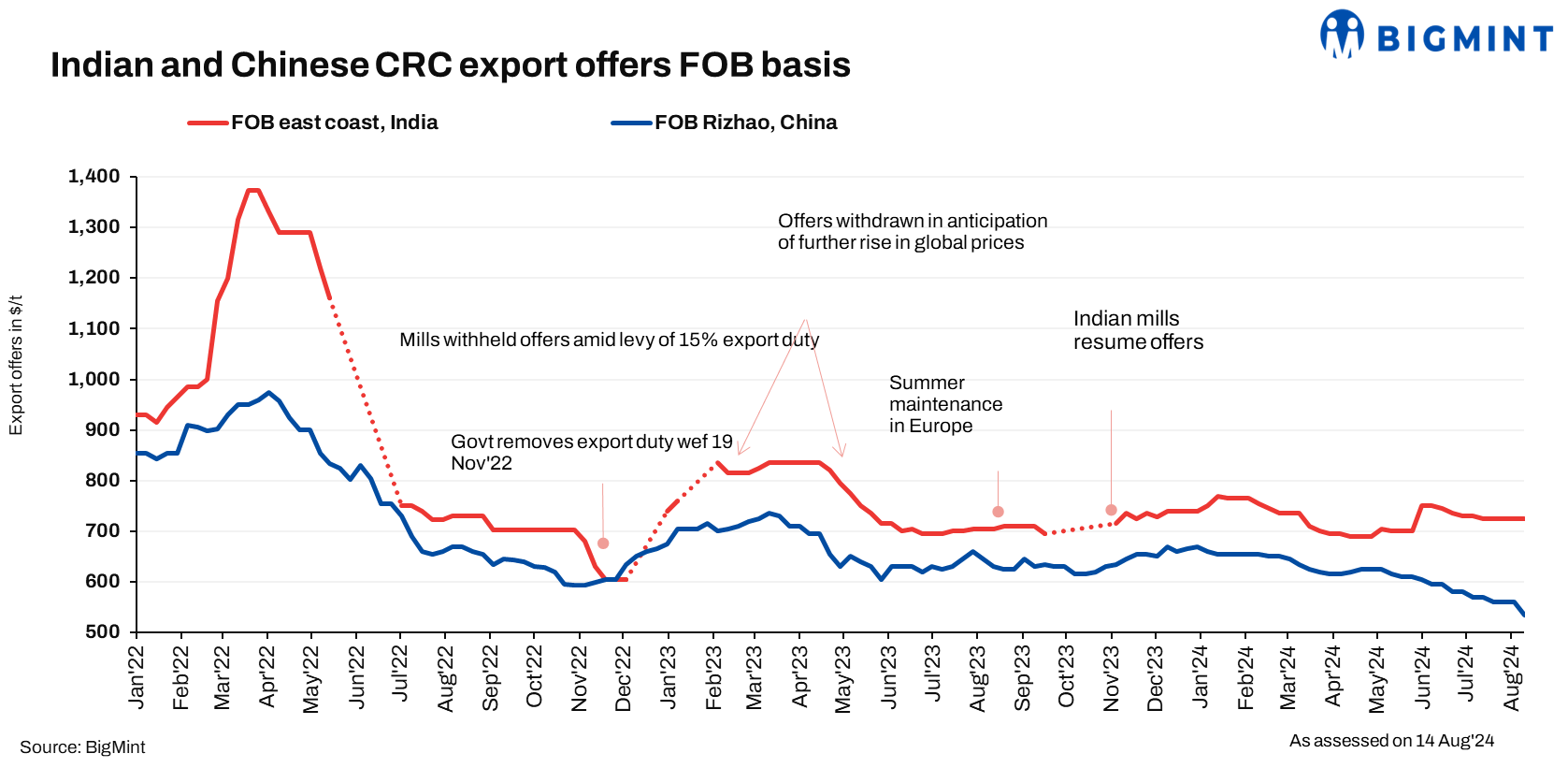 Indian CRC export offers to the European Union (EU) remained flat w-o-w at $725-730/t CFR Antwerp ($675-685/t FOB east-coast India), amid quiet seasonal demand. However, the region experienced minimal trading as a result of the holiday season. Chinese CRC export offers to the EU fell by $20/ w-o-w to $535/t FOB compared with $555/t last week.