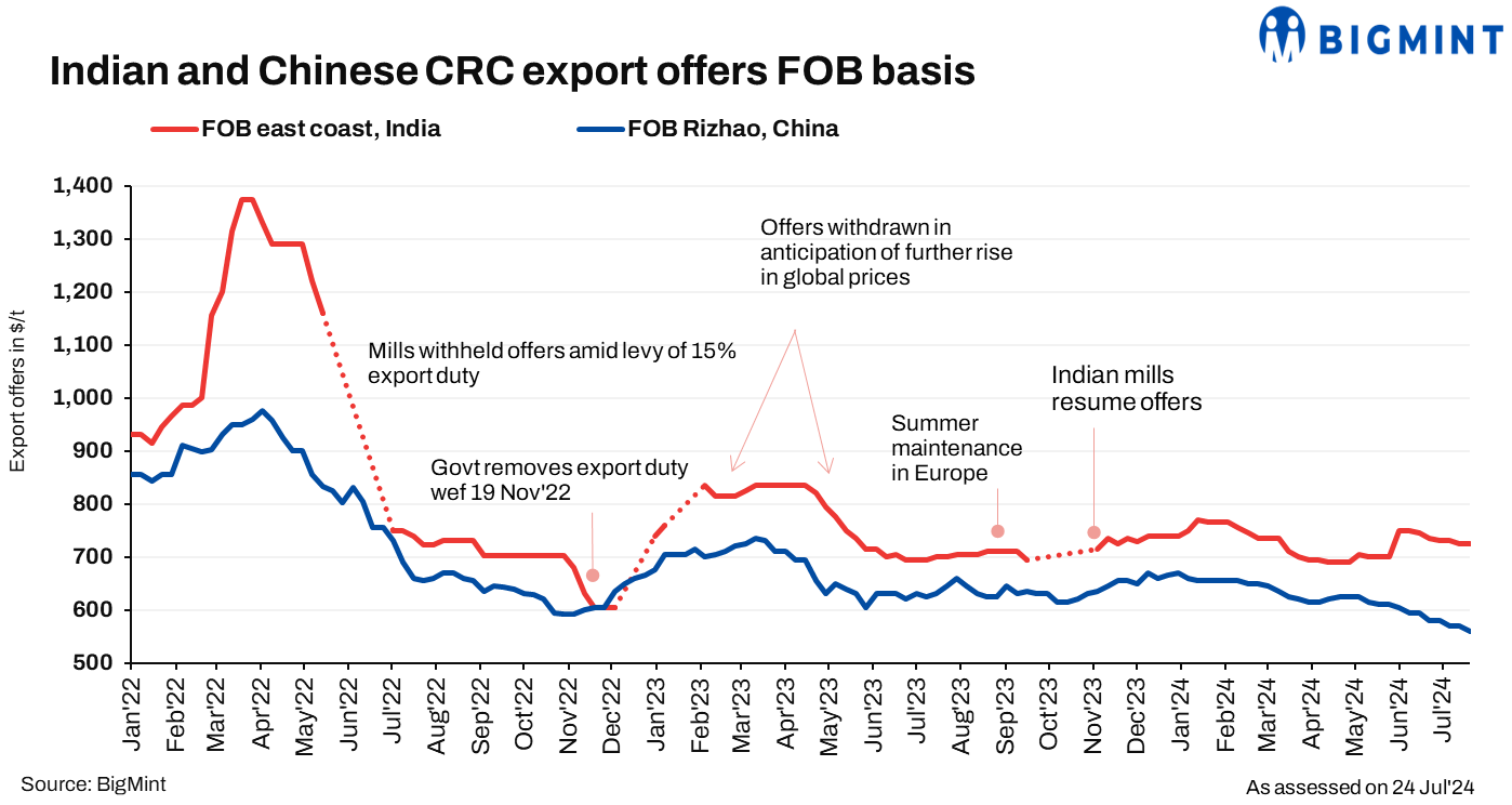 Indian cold rolled coil (CRC) export offers to Europe remained unchanged for the week at $725-730/tonne (t) CFR Antwerp ($675-680/t FOB east-coast India) due to soft summer demand and overflowing inventories. However, a deal of around 5,000 t was concluded at $800/t CFR Antwerp for late-August shipments.