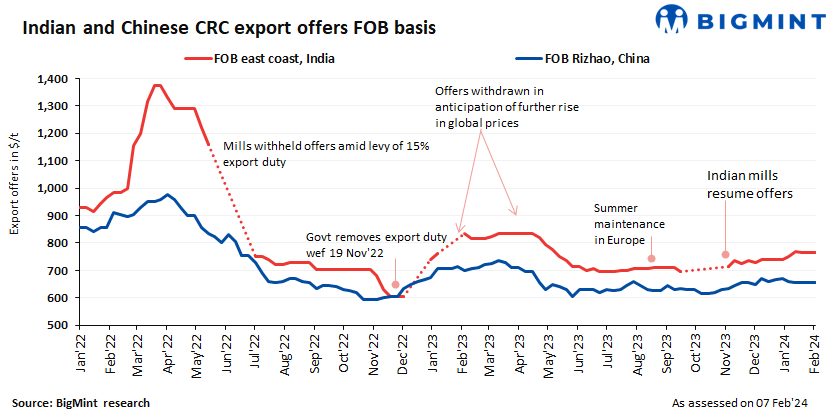 Indian CRC export offers remained stable w-o-w at around $815-820/t CFR Antwerp ($765-770/t FOB east-coast India) as mills are booking at similar price levels, informed sources. Indian CRC exports surged to 79,040 t in Dec’23 against 6,974 t a month ago. In addition, Chinese CRC export offers also remained flat w-o-w at $655/t FOB ahead of Lunar New Year holidays.