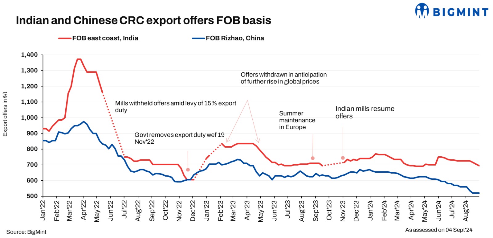 Chinese CRC export offers remained stable w-o-w at $520/t FOB. Furthermore, the downtrend in the Chinese steel market has had a negative impact on global sentiments, further contributing to the downward pressure on HRC prices.