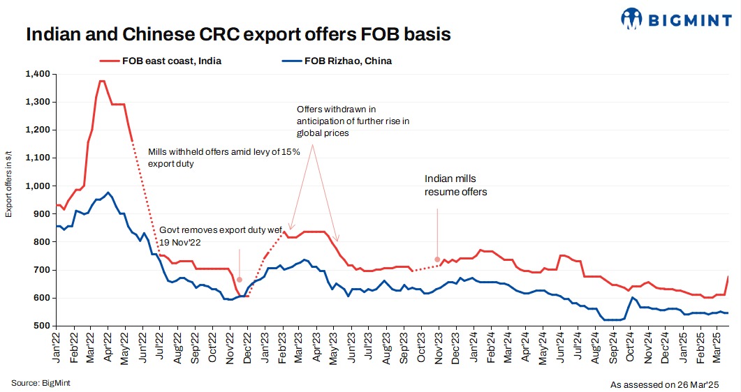 Indian cold rolled coil (CRC) export offers to Europe rose by $65-70/t, to hover at around $675-680/t FOB east coast, India ($725-730/t CFR Antwerp). Moreover, a deal of around 7,000 tonnes (t) was heard concluded at $725/t for April 2025 sales.