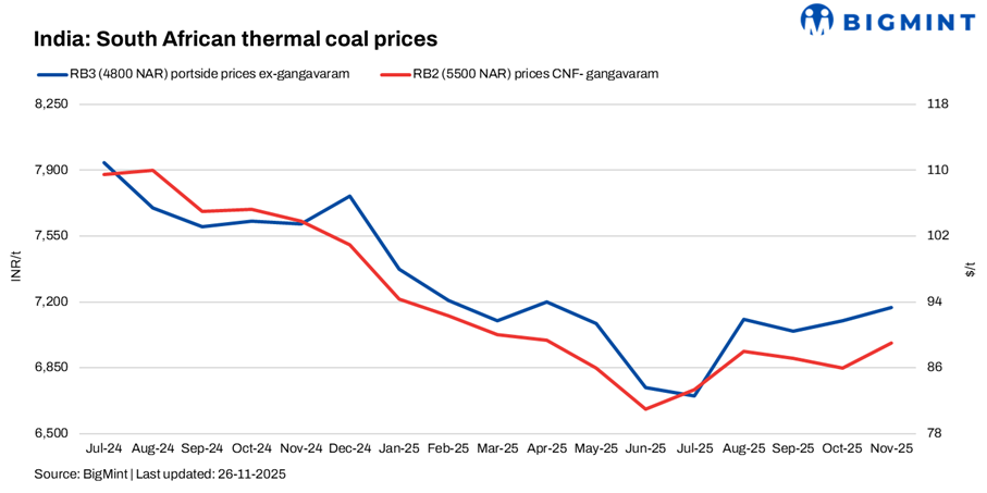 Notably, Indian portside South African thermal coal prices remained unchanged w-o-w, with RB2 at INR 8,400/t ex-Paradip, INR 8,350/t at Vizag, and INR 8,400/t at Gangavaram. Market sentiment remained stable, supported by firm offers for January-February bookings, which continued to reflect steady interest in South African material.