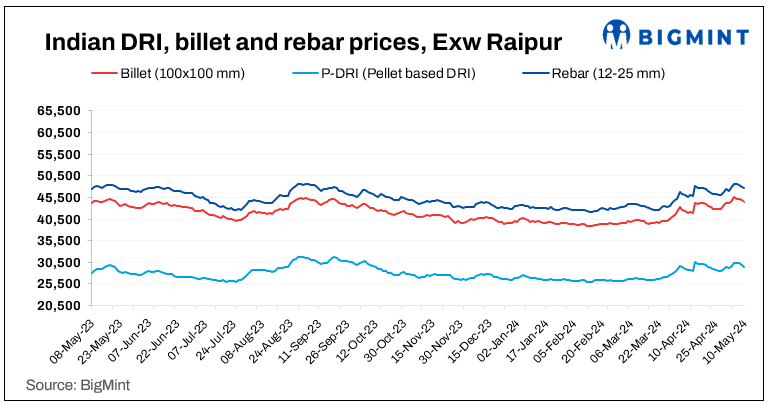 India’s induction furnace (IF) steel prices continued moving south on 10 May 2024. Offers announced by the mills decreased in the range of INR 50-800/tonne (t) d-o-d compared to the previous trading session.