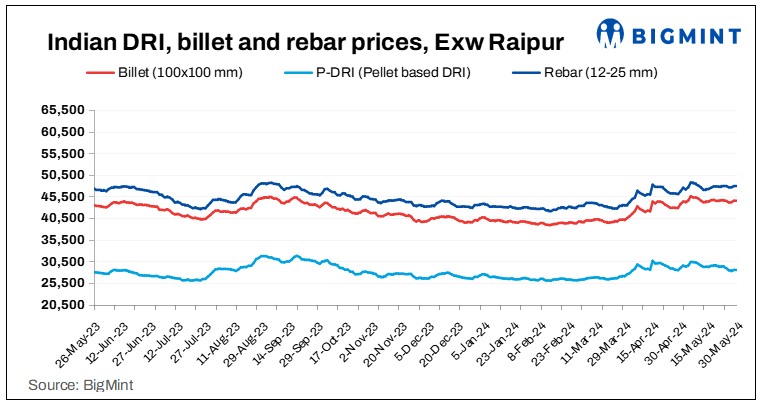Sponge iron prices varied by INR 100-300/t. Prices in Raigarh dropped by INR 300/t. Meanwhile, the same rose by INR 100/t in Ramgarh.