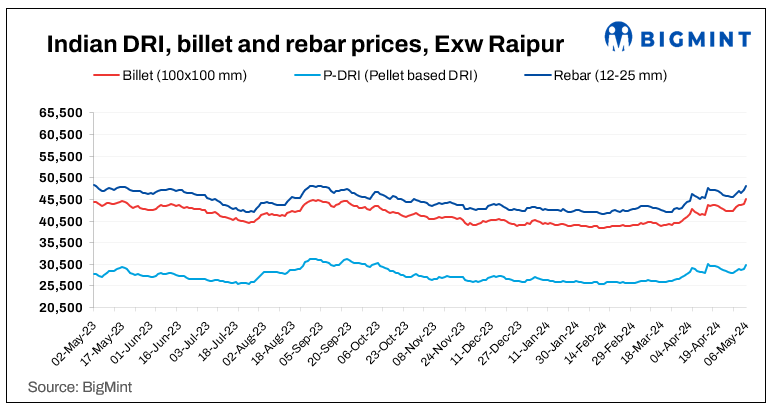 Billet prices increased by INR 500-1,100/t. The Raipur market saw an increase of INR 1,100/t today.