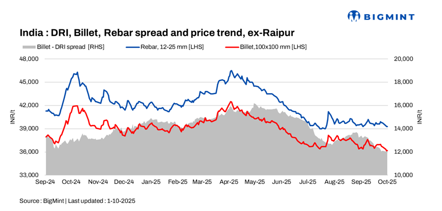 The conversion spread from sponge iron (PDRI) to billets for the standalone induction furnaces in the Raipur cluster was assessed at INR 12,100/t.
