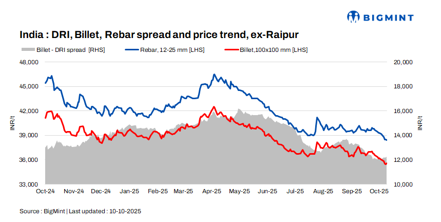 The conversion spread from sponge iron (PDRI) to billets for the standalone induction furnaces in the Raipur cluster was assessed at INR 12,100/t.