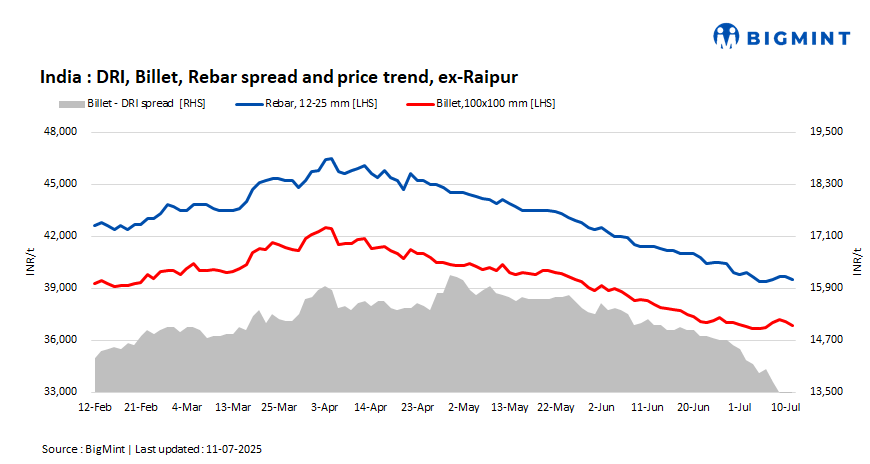 Rebar (Fe 500) prices fell by INR 100-300/t d-o-d, with the highest drop of INR 300/t seen in Raigarh.