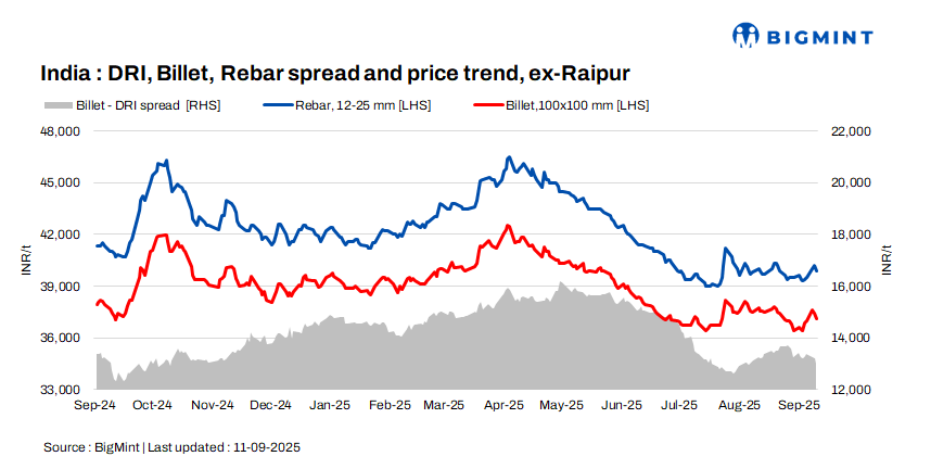 The conversion spread from sponge iron (PDRI) to billets for the standalone induction furnaces in the Raipur cluster was assessed at INR 13,000/t.