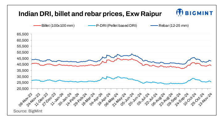 Sponge iron prices fell INR 100-700/t, with the steepest drop in the Raigarh market.