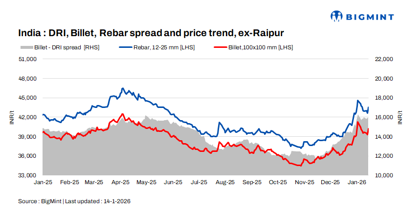 The conversion spread from sponge iron (PDRI) to billets for the standalone induction furnaces in the Raipur cluster was assessed at INR 16,150/t.
