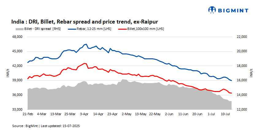 The conversion spread from sponge iron (PDRI) to billets for standalone induction furnaces in the Raipur cluster was assessed at INR 13,150/t.