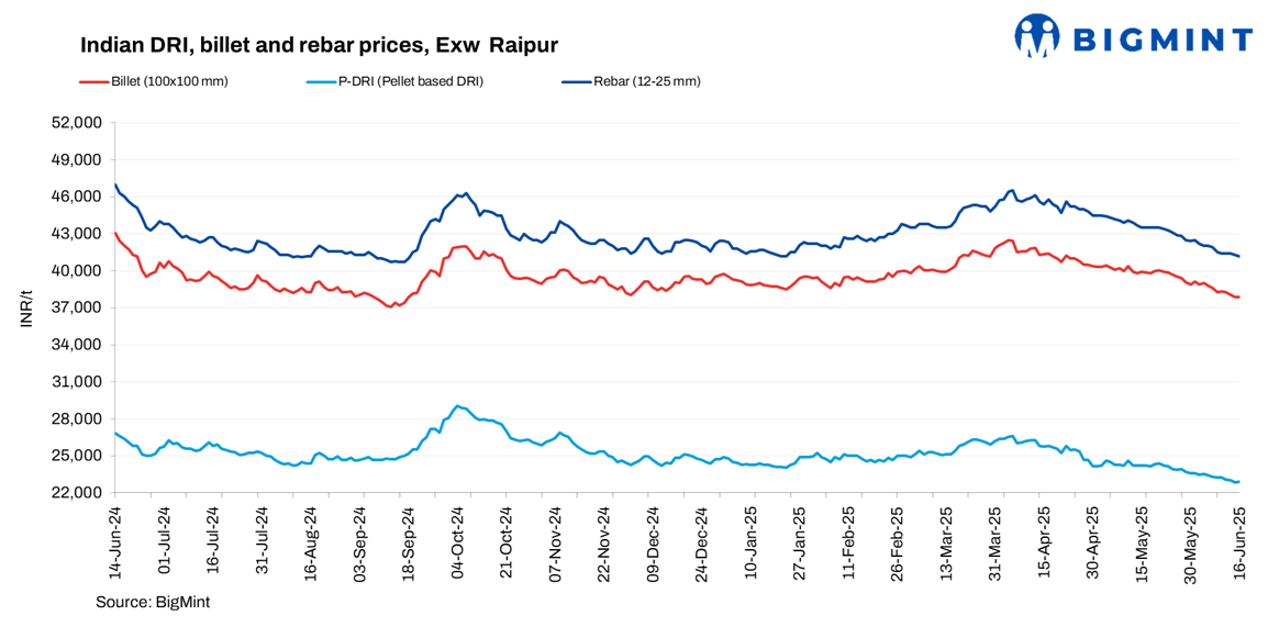 Rebar (Fe 500) prices decreased by INR 100-700/t d-o-d, with the steepest fall of INR 700/t seen in Jalna.