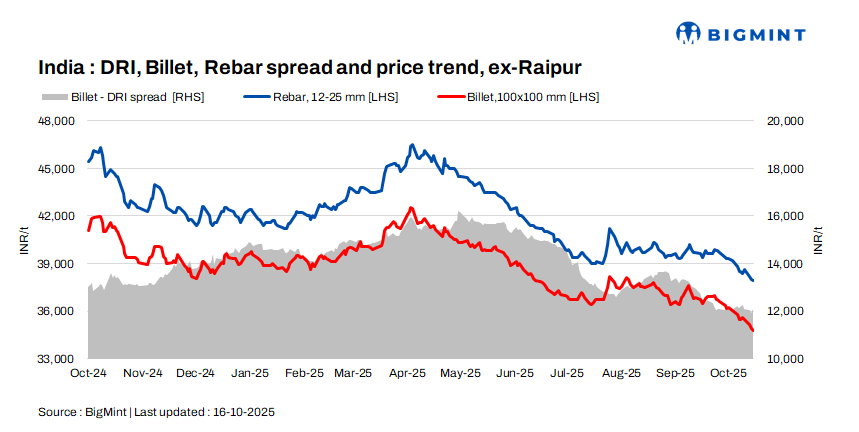 The conversion spread from sponge iron (PDRI) to billets for the standalone induction furnaces in the Raipur cluster was assessed at INR 12,250/t.