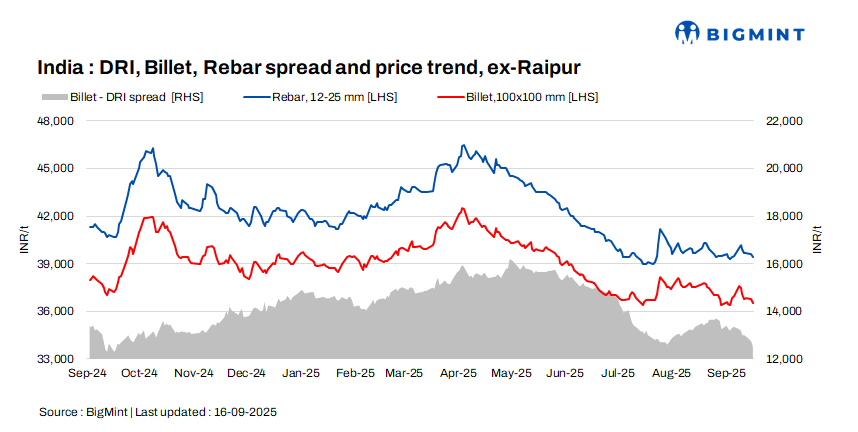 The conversion spread from sponge iron (PDRI) to billets for the standalone induction furnaces in the Raipur cluster was assessed at INR 12,500/t.