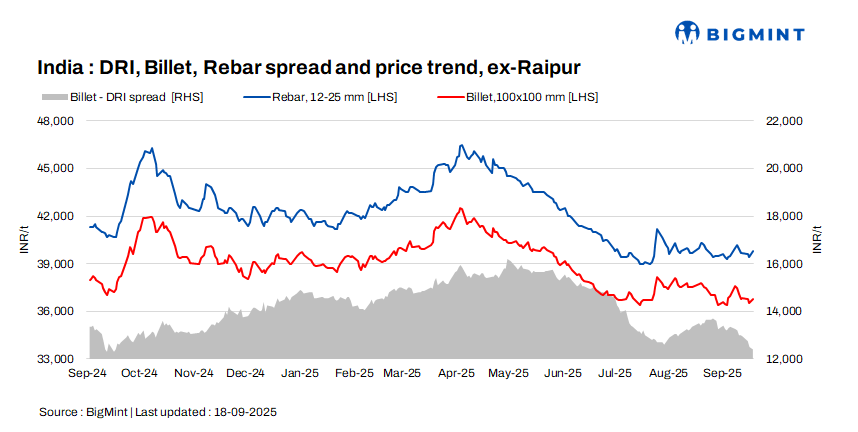The conversion spread from sponge iron (PDRI) to billets for the standalone induction furnaces in the Raipur cluster was assessed at INR 12,400/t.