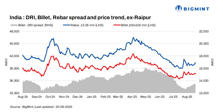 The conversion spread from sponge iron (PDRI) to billets for standalone induction furnaces in the Raipur cluster was assessed at INR 13,500/t.