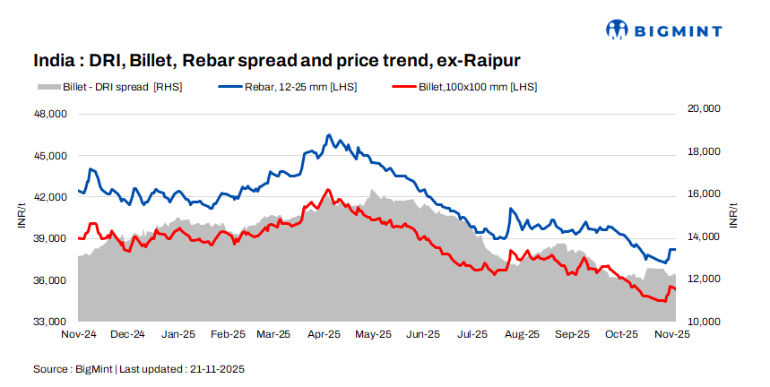 The conversion spread from sponge iron (PDRI) to billets for standalone induction furnaces in the Raipur cluster was assessed at INR 12,050/t.