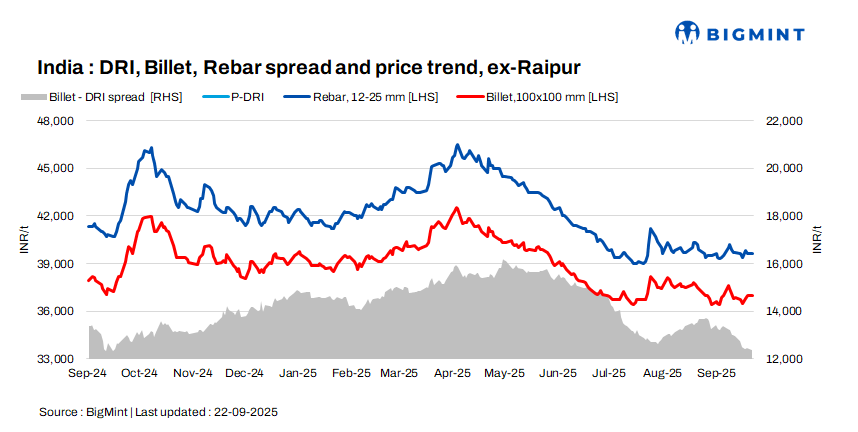 The conversion spread from sponge iron (PDRI) to billets for the standalone induction furnaces in the Raipur cluster was assessed at INR 12,350/t.