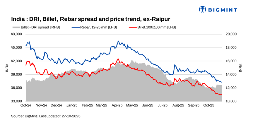 The conversion spread from sponge iron (PDRI) to billets for the standalone induction furnaces in the Raipur cluster was assessed at INR 12,450/t.