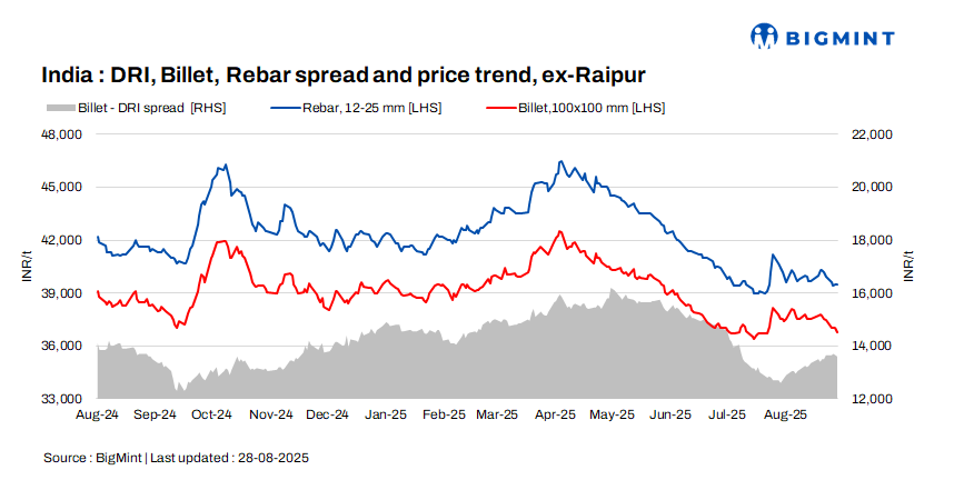 The conversion spread from sponge iron (PDRI) to billets for standalone induction furnaces in the Raipur cluster was assessed at INR 13,600/t.