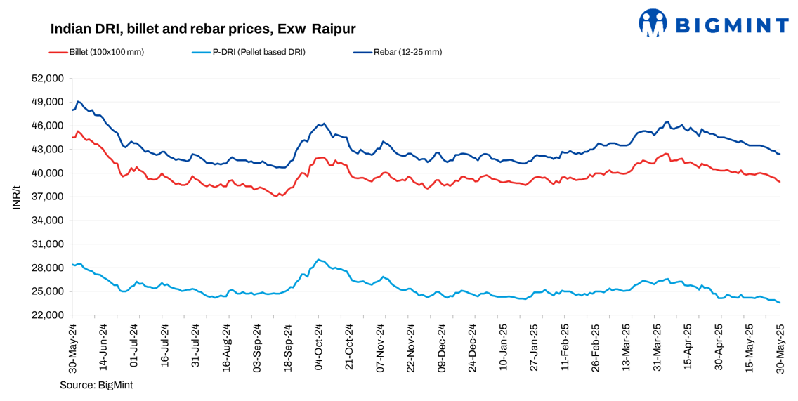 Sponge iron prices decreased by INR 100-150/t d-o-d, with the highest drop of INR 150/t seen in Raipur and Bellary.
