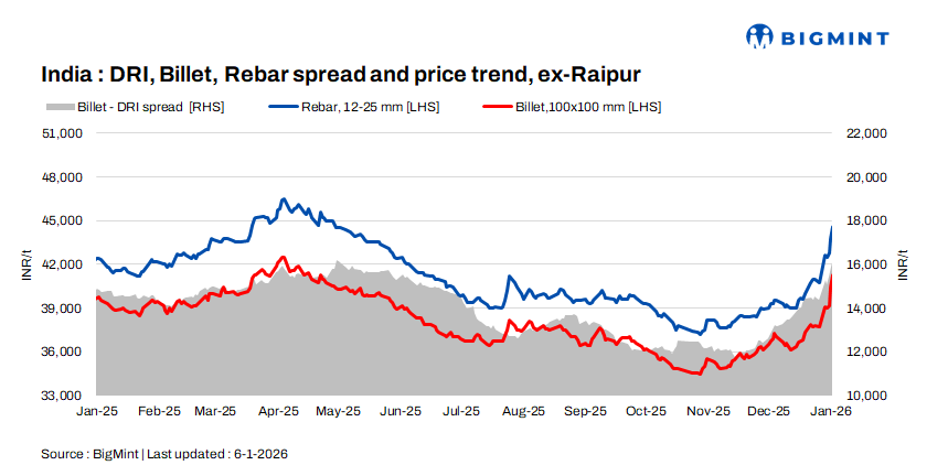 The conversion spread from sponge iron (PDRI) to billets for standalone induction furnaces in the Raipur cluster was assessed at INR 15,700/t.