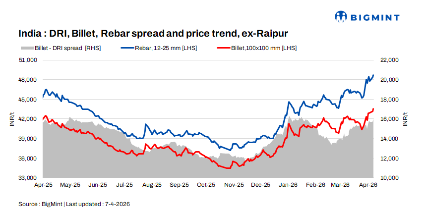 The conversion spread from sponge iron (PDRI) to billets for the standalone induction furnaces in the Raipur cluster was assessed at INR 16,000/t.