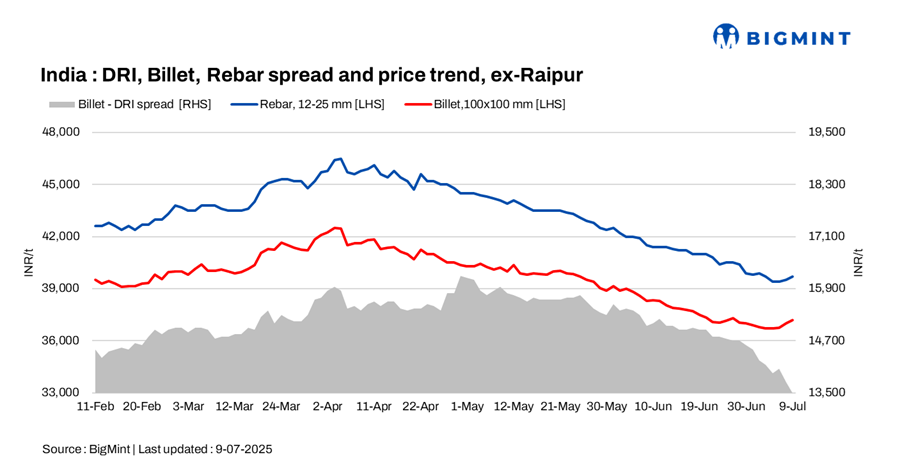 The conversion spread from sponge iron (PDRI) to billets for standalone induction furnaces in the Raipur cluster was assessed at INR 13,500/t.