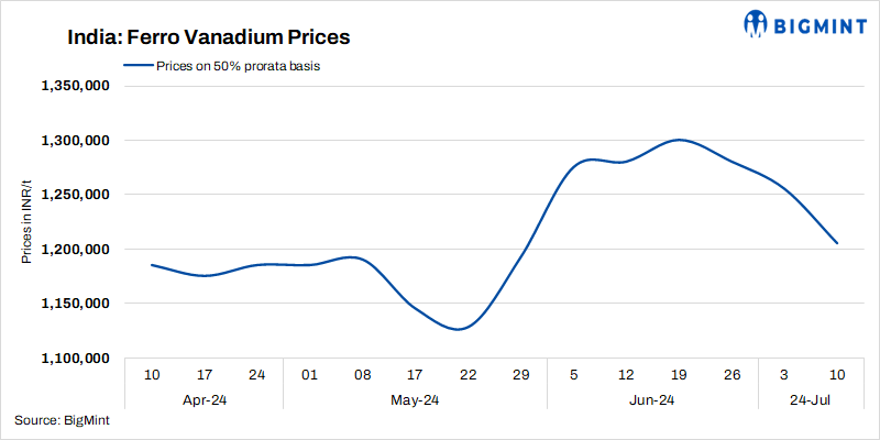 Indian ferro vanadium prices declined on 10 Jul’24, with FeV 50% prices at INR 1,205,000/t ($14,432/t) ex-works (50% prorate) diminished w-o-w by INR 50,000 ($599/t), as per BigMint’s assessment. The ferro vanadium market in India took a downtrend this week with sluggish demand and need-based purchases. Meanwhile, a key producer mentioned, “The market operated cautiously and showed hesitance towards higher quotes, hence suppressed the prices.”