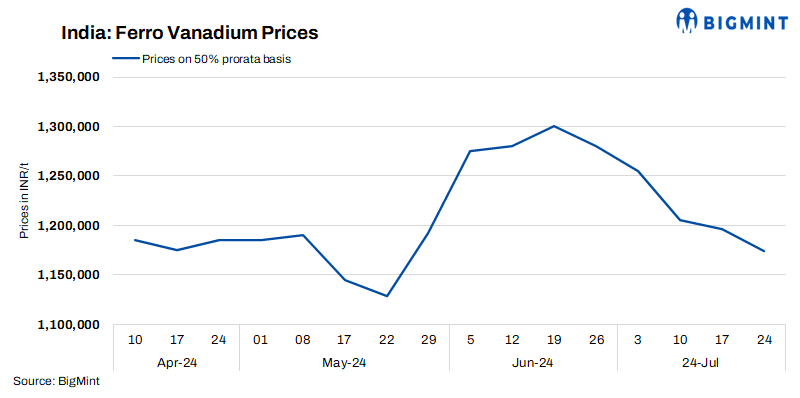 Indian ferro vanadium prices decreased on 24 Jul’24, w-o-w by INR 22,600 ($270/t). FeV 50% prices stood at INR 1,174,000/t ($14,026/t) exw-Raipur (50% prorate) as per BigMint’s assessment. The ferro vanadium market in India persisted its downtrend this week as the market witnessed lower trade activities and unacceptance towards higher quotes. BigMint anticipates that prices will fluctuate in these levels in the near term.