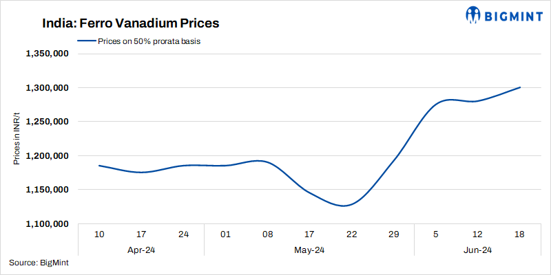 Indian ferro vanadium prices inched up by INR 20,000/t this week, with FeV 50% prices ranging between INR 1,280,000-1,300,000/t ($15,347-$15,586/t) ex-works (50% prorate). As manufacturers’ quotations have risen, the low-priced material in the market have decreased, but the actual high-priced transactions of buyers were still relatively small. The supply and demand sides of the market remained mostly in a stalemate and wait-and-see mode.