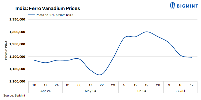 Indian ferro vanadium prices remained largely stable on 17 Jul’24, with slightly fall w-o-w by INR 8,400 ($101/t), FeV 50% prices stood at INR 1,196,600/t ($14,320/t) ex-works (50% prorate) as per BigMint’s assessment. The ferro vanadium market in India took a slight downtrend this week with no major movements in the market. Meanwhile, the demand remained subdued which suggests a cautious market outlook.