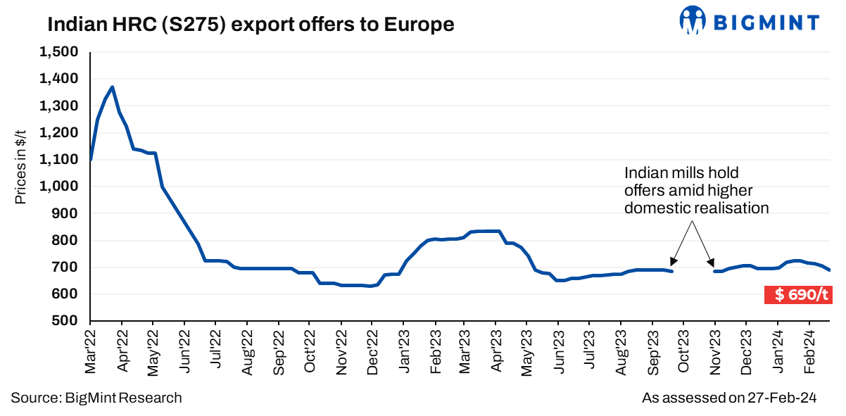 Indian HRC exports to Europe (S275, 3mm) declined by around $10-15/t w-o-w. Current offers are around $685-690/t CFR Antwerp ($635-640/t FOB east-coast India) against $700-705/t CFR Antwerp last week. Offers dropped w-o-w due to weak buyer demand. Both high existing inventories and limited end-user demand led buyers to avoid restocking, prompting Indian steelmakers to offer lower export prices for HRC.