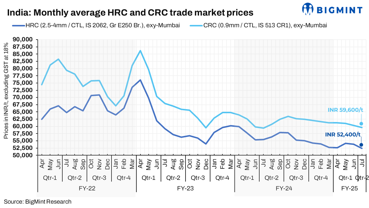 The preference for cheaper imported HRC has impacted prices. Total steel import volumes (including flats, longs, and semis) increased 16% y-o-y to 0.65 million tonnes (mnt) in July, consistently surpassing the 0.6 mnt mark for most of January-July 2024. Import volumes rose by approximately 4.8% m-o-m in July and around 10.7% m-o-m in June this year.