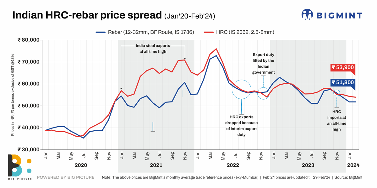 Indian HRC-rebar price spread (Jan’20-Feb’24)