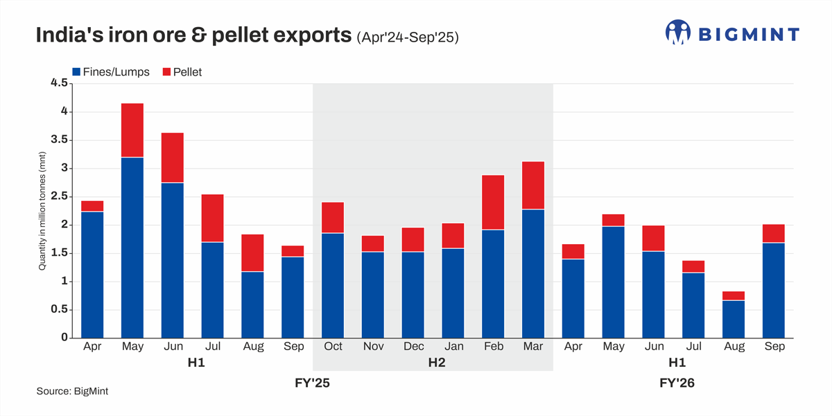 Indian iron ore and pellet exports plunged by 38% y-o-y to 10.11 million tonnes (mnt) in the first half of FY’26, as per data available with BigMint. However, the y-o-y percentage decrease narrowed from the 45% recorded in 5MFY’26, driven by a sharp m-o-m rebound in September 2025.