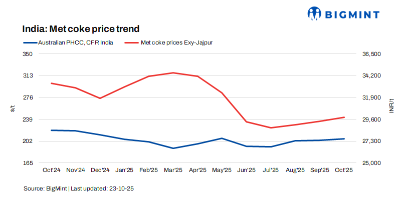 India’s metallurgical coke market remained stable w-o-w on 23 Oct’25, as trading was subdued amid Diwali and Gujarati Labh Panchmi festivities. BF-grade (25-90 mm) met coke was assessed at INR 29,900/t ex-Jajpur in eastern India and INR 30,000/t ex-Gandhidham in the west. Foundry-grade met coke held steady at INR 35,500/t ex-Rajkot, reflecting limited buying interest during the holiday period.
